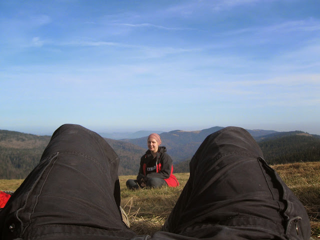 Jak widać na powyższym zdjęciu pogoda dopisywała. Było ciepło (potem się przebierałam z tej koszulki), słonecznie, plecak przestał ciążyć :) na Starych wierchach zjedliśmy co nieco, pośpiewaliśmy i obkupiliśmy się w pyszne oscypki (jeden za 1 zł!) od miłego pana. Potem ok 1,5 h marszu podczas którego zwolniłam bo zaczynałam się męczyć. Od schroniska była wyrypa, ale do przejścia. Najgorsze było błoto, które było trzeba omijać. Mijając lasy, połoniny dotarliśmy do polany, na której zarządzony był dłuższy postój. No i znowu gitara, mały dopalacz (]:->) i tańce!